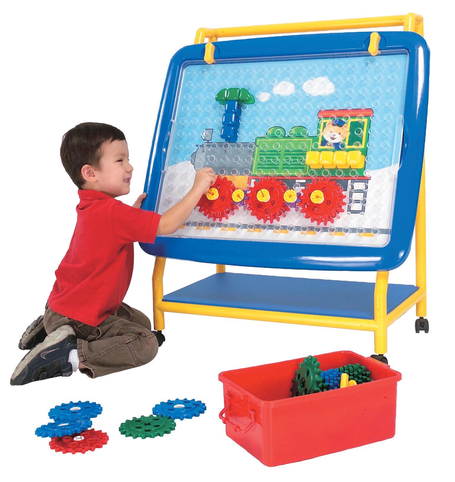 Закрепите на доске специальные карточки с изображениями арт. 1195-4 "Рабочие карточки для набора Шестеренки" (приобретаются отдельно). Пусть ребенок начнет прикреплять шестеренки к основе для творчества, постепенно воспроизводя рисунок.