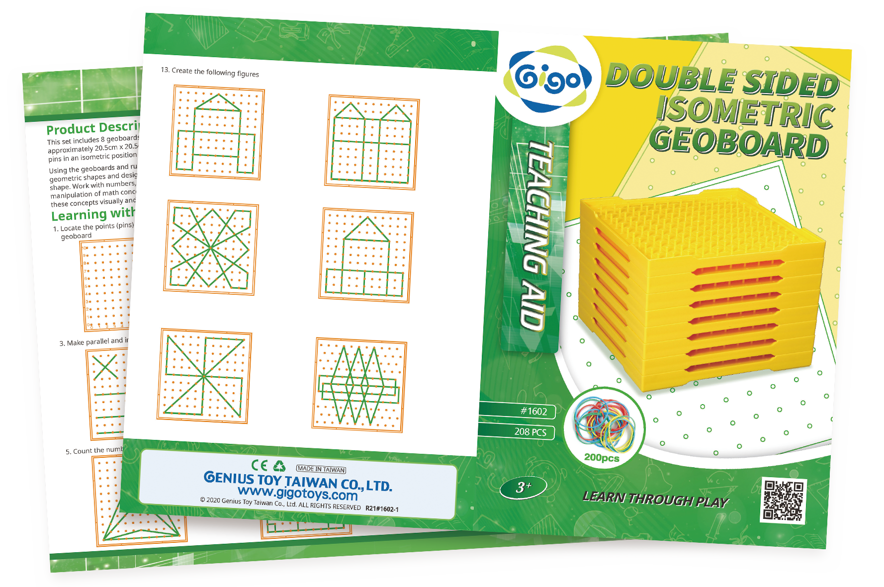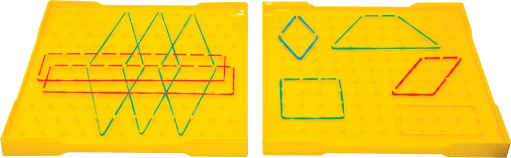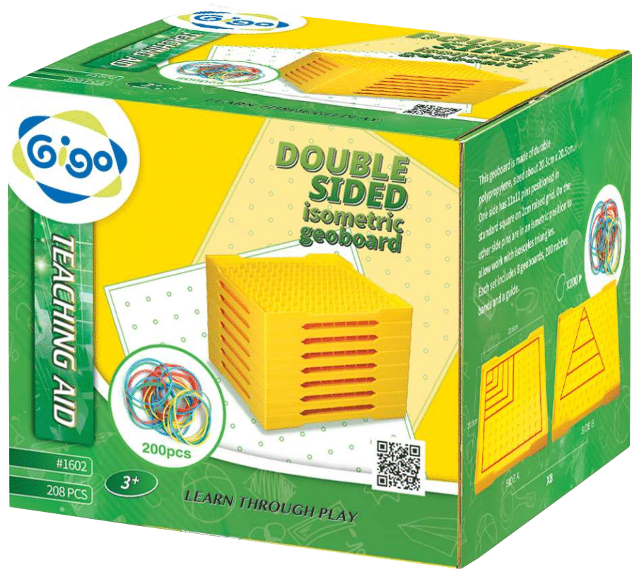 GIGO 1602 Набор математических планшетов представляет собой несколько квадратных основ желтого цвета со штырьками, на которые нанизываются цветные резиночки. С помощью набора ребенок сможет создавать удивительные геометрические узоры.