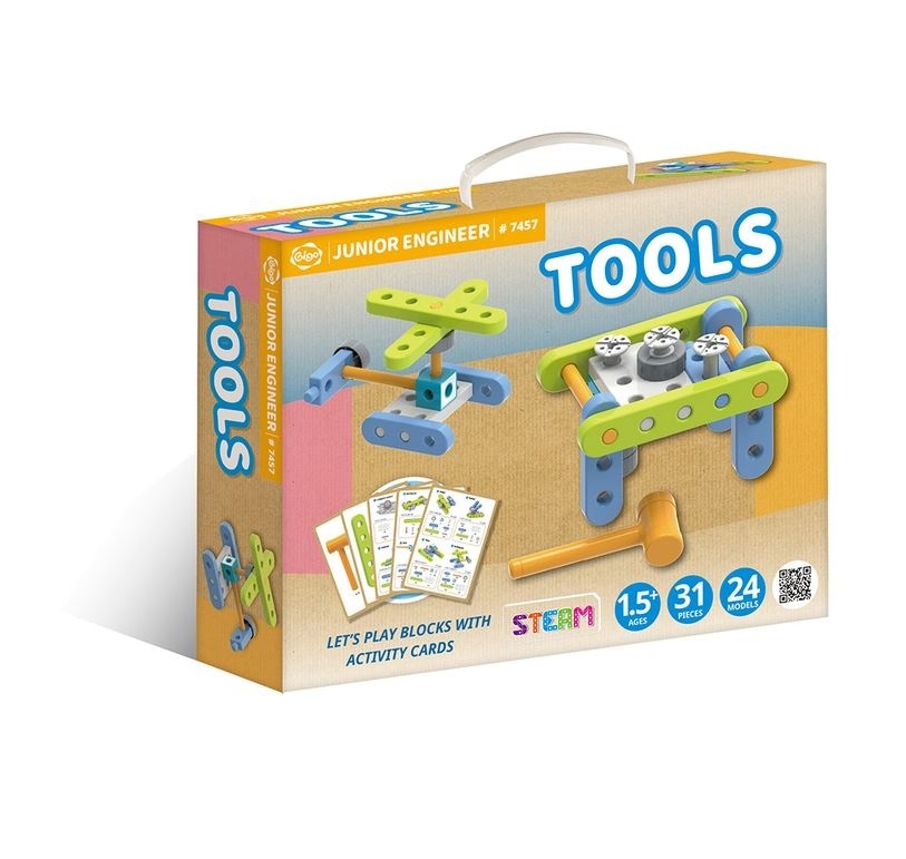 GIGO 7457 Первые шаги (обновленная версия) объединил в себя детали наборов Юный инженер и Юный инженер - волшебные шестерни. Все детали окрашены в спокойные пастельные цвета. Они легкие и прочные, но при этом надежно соединяются друг с другом. Таким образом, в наборе есть панели и балки, болты, гайки, колеса, полусферы, шестеренки двух видов – маленькие с шестью зубчиками и большие с восемнадцатью зубьями, а также пластмассовые инструменты - молоток, отвертка.