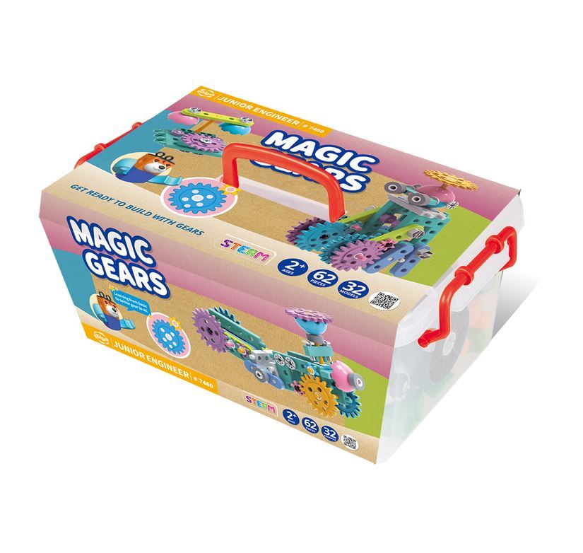 Набор «Юный инженер-волшебные шестерни» упакован в прозрачный пластиковый контейнер с крышкой и боковыми ручками для удобства переноски.