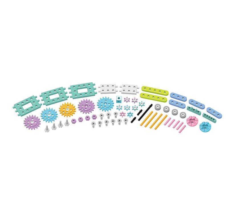 В состав набора входит 62 детали: винты и гайки, соединительные панели и балки, оси и колеса, шестеренки. Покажите крохе, как работать каждым из них – и после пары-тройки игр он сможет управляться с ними совсем как взрослый!
