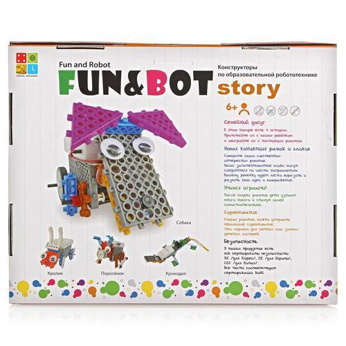 Конструктор HUNA (Fun&Bot 1) MRT1 Story позволяет собирать простые модели животных. Животные издают разные звуки, двигаются в разных направлениях и с разными скоростями (запрограммировано 4 режима). Набор выполнен из яркого, крепкого и безопасного ABC-пластика. В комплект прилагаются инструкции, которые кроме подробных инструкций по сборке моделей, содержат несколько увлекательных сказок, персонажей которых предлагается собрать ребенку.