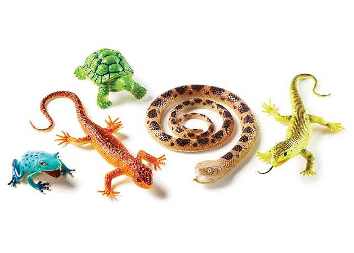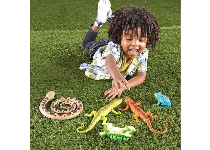 Набор включает пять гигантских фигур рептилий и земноводных: черепаху, геккона, змею, игуану и древесную лягушку.