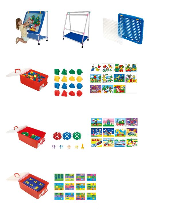 1. 1177-1 "Детская развивающая доска" Gigo включает два элемента: синее основание с отверстиями, в которые могут вставляться дополнительные элементы, накладываться карточки и прозрачную панель, которая крепится на синем основании с помощью двух стопоров желтого цвета и удерживает обучающие карточки и трафареты, имея при этом такие же отверстия, как и основание.