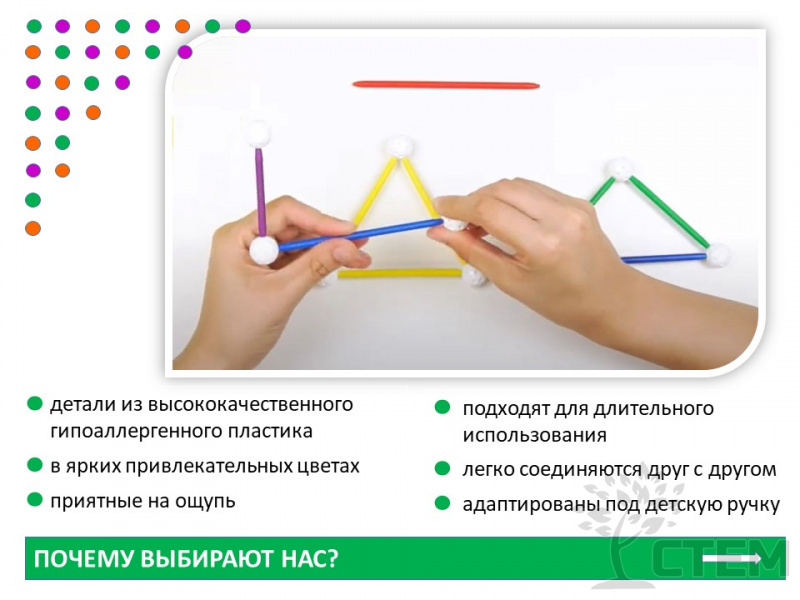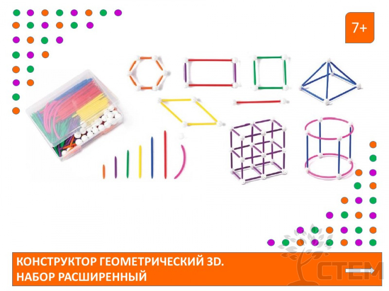 Этот конструктор для изучения основ математики не только улучшит мелкую моторику ваших детей, он будет также развивать творческие навыки и пространственное воображение, позволяя построить двух и трехмерные фигуры. Он знакомит детей с основными геометрическими формами и помогает придумать новые.