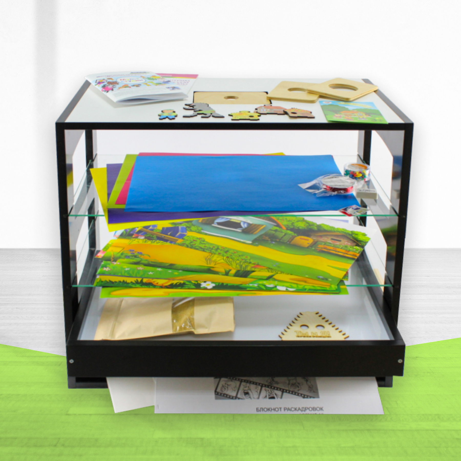Кукольный театр "Сказки на столе", фоны для съёмки различной тематики, раскадровка — журнал для зарисовок, хромакей — однотонный фон, ватман А3 и А4, набор творческий (проволока, ластик, клячка, кнопки, песок 1 кг, набор для песочной анимации).