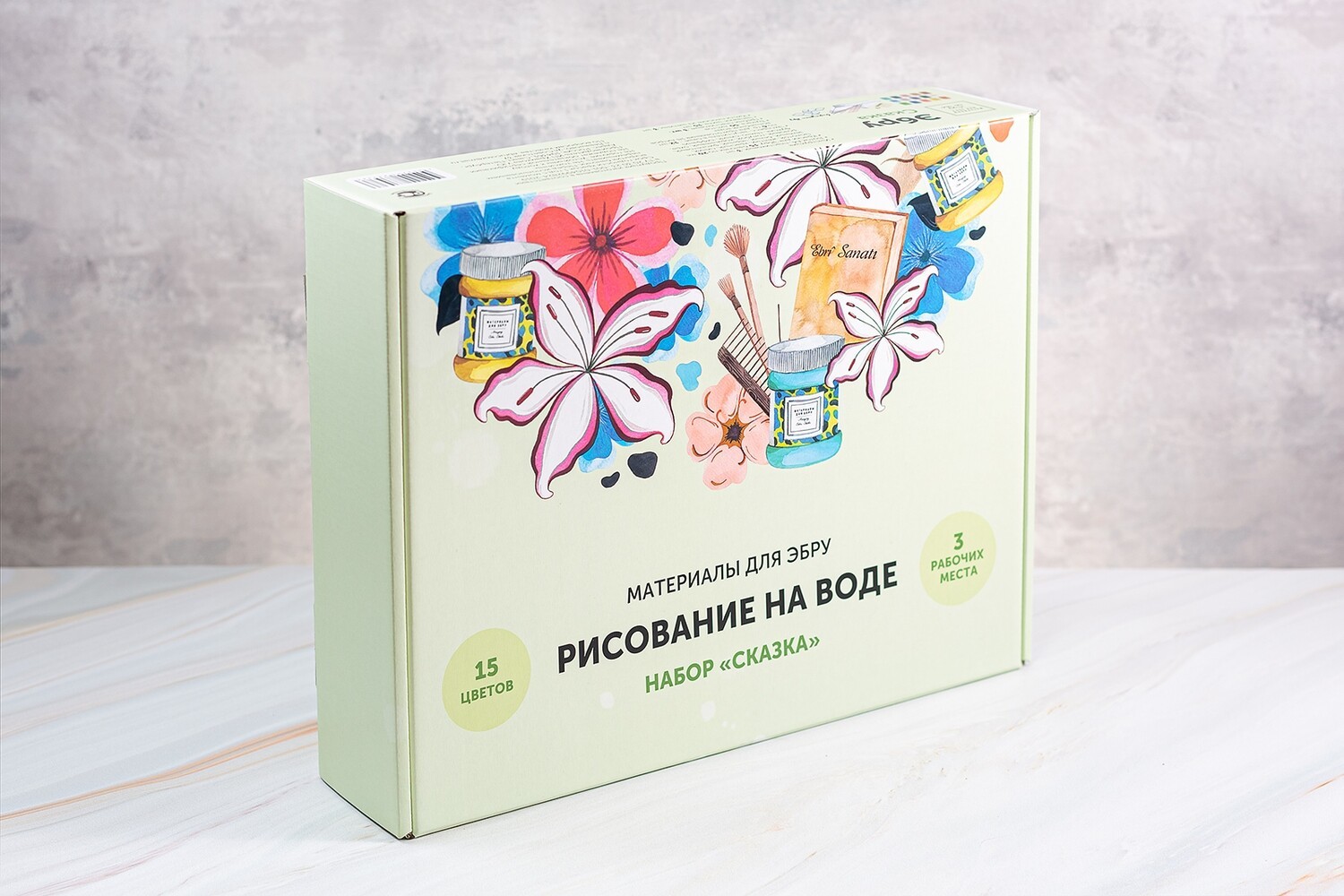 Набор для рисовани Эбру Сказка - самая популярная в линейке наборов для Эбру. В ее состав входят необходимые предметы и материалы для творчества живописи по воде. Вам остается только открыть коробку и начать творить свою сказку на воде.