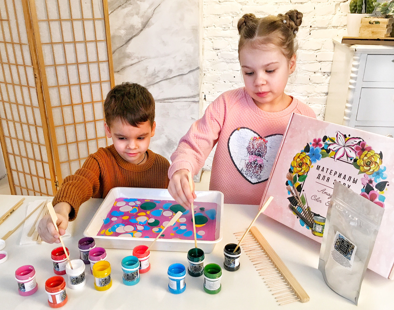 - сухой экспресс-загуститель в саше по 6 гр. - 12 штук. Для приготовления 18 литров жидкого раствора. Одного саше с загустителем идет для одной сессии рисования в одном лотке, хватит для создания 5-7 картин.