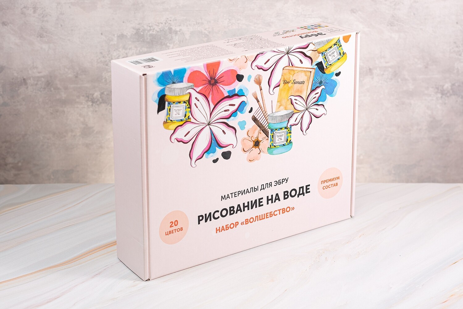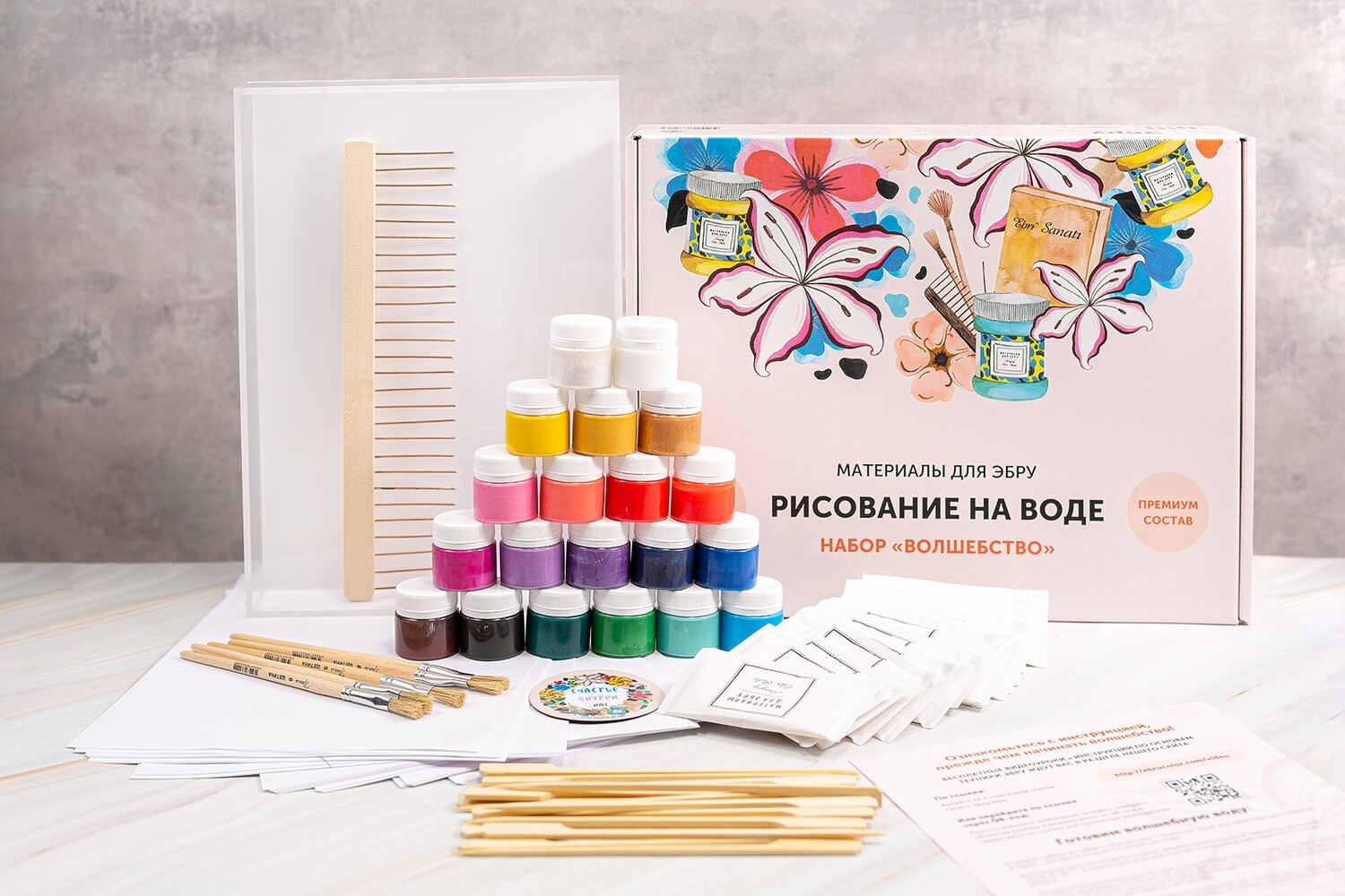 Набор для рисовани Эбру Сказка - самая популярная в линейке наборов для Эбру. В ее состав входят необходимые предметы и материалы для творчества живописи по воде. Вам остается только открыть коробку и начать творить свою сказку на воде.