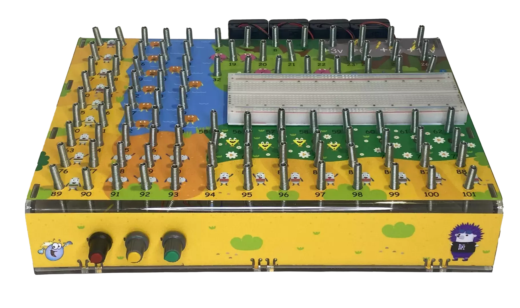 Игровой комплекс «Электроника для юных гениев» включает монтажный столик, предназначенный для упрощения сборки электронных схем. Он создает возможность собирать и тестировать их без пайки соединений. Для сборки схем необходимо просто отогнуть пружинку и вставить клемму провода, соединяя контакты. Такой способ соединения проводов абсолютно безопасен для ребенка, прост и понятен. Вся электронная база основных компонентов (резистор, конденсатор, транзистор, сопротивление и др.), используемая на монтажном столике, представлена в виде веселых человечков – помощников основного персонажа Ёжика Терри.