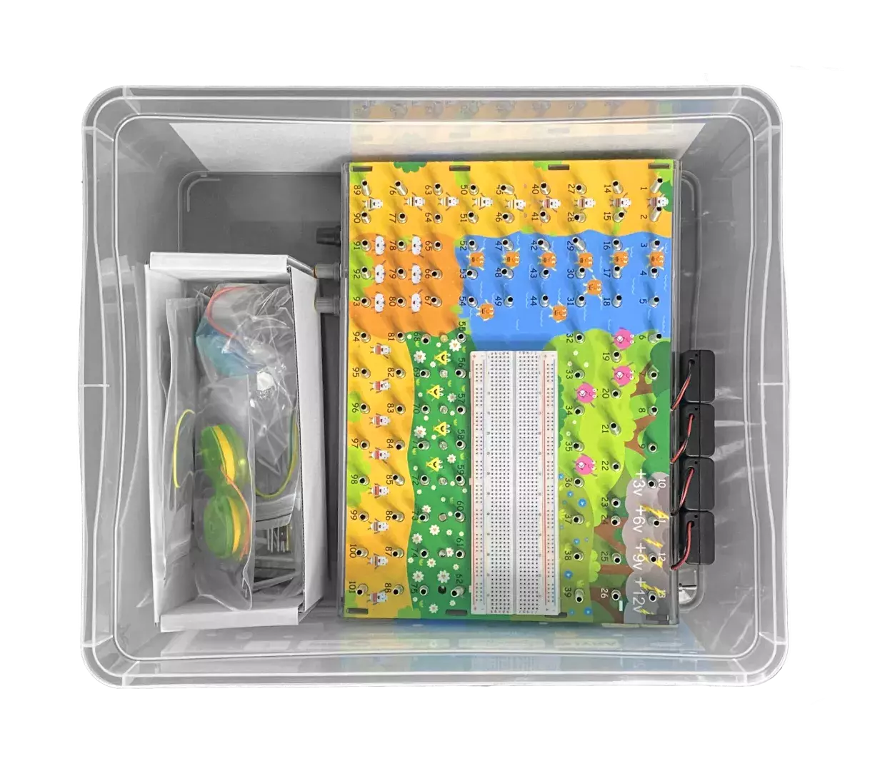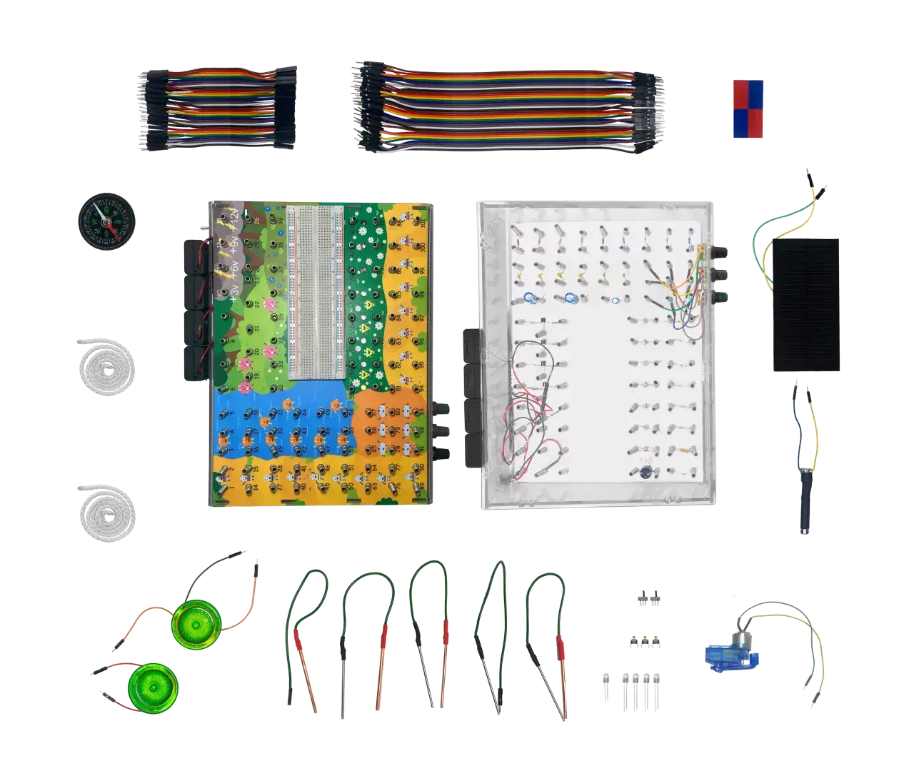 Комплекс «Электроника для юных гениев» позволяет расширить возможности обучения за счёт использования макетной платы. С её помощью подключаются дополнительные устройства, которые позволяют лучше познакомиться со свойствами электричества и электромагнитных полей. В состав образовательного комплекса входят дополнительные компоненты: