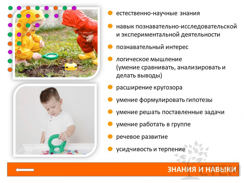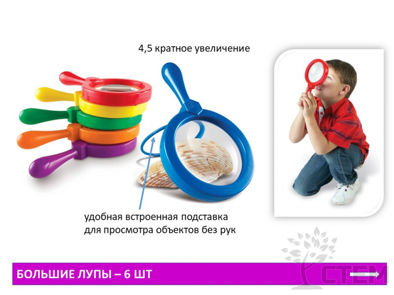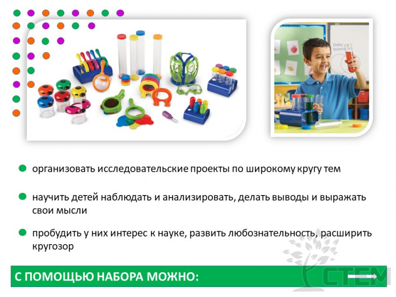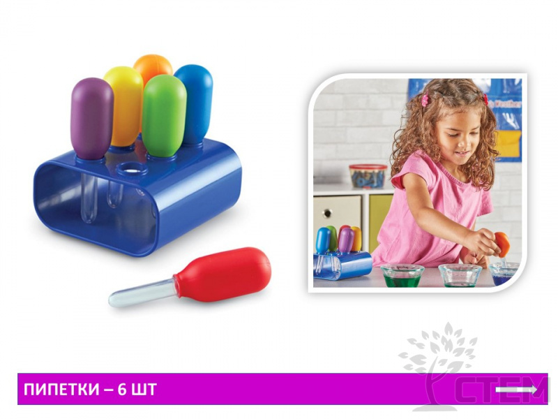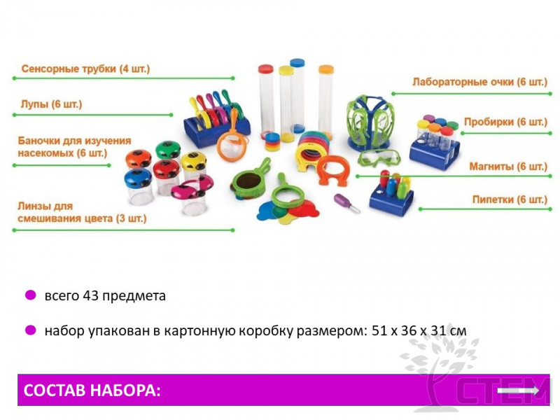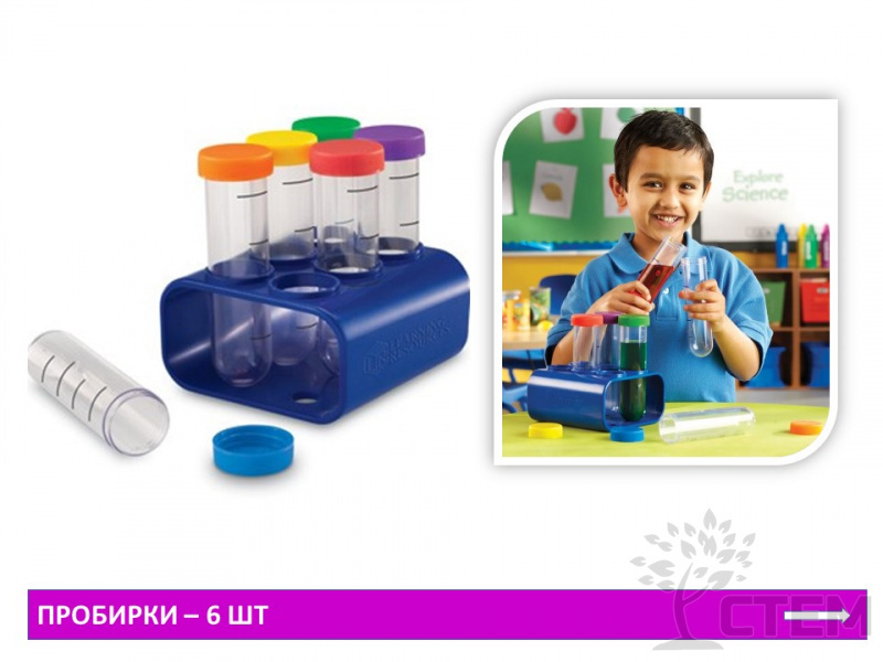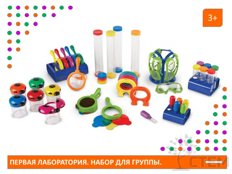 Набор для группы "Первая лаборатория" предназначен для познавательно-исследовательской деятельности: основной целью является создание экспериментальной деятельности, активным участником которой выступает ребёнок. Непосредственное участие ребёнка в ходе эксперимента позволяет ему воочию увидеть процесс и результаты. Знакомит с основами физики, биологии, химии.